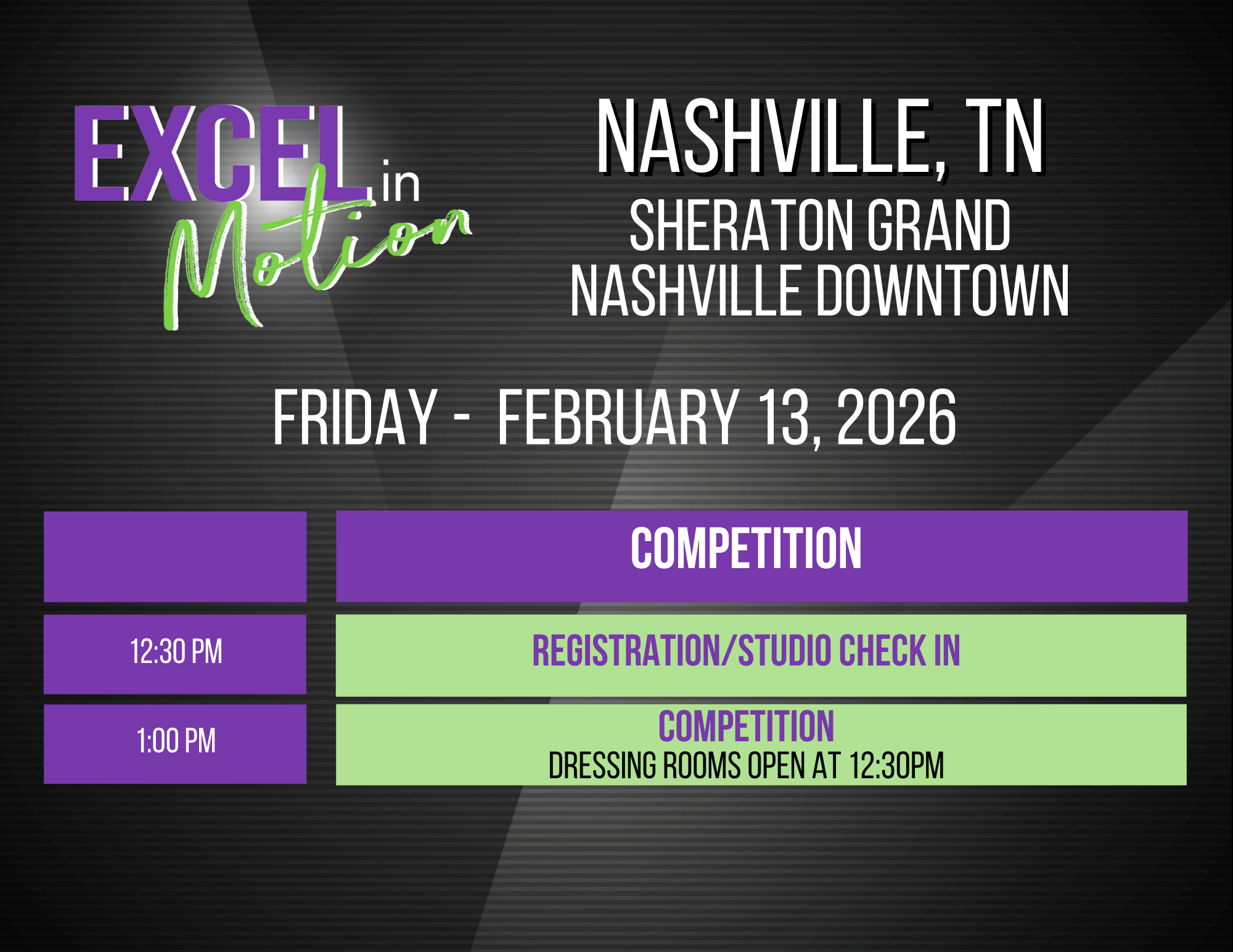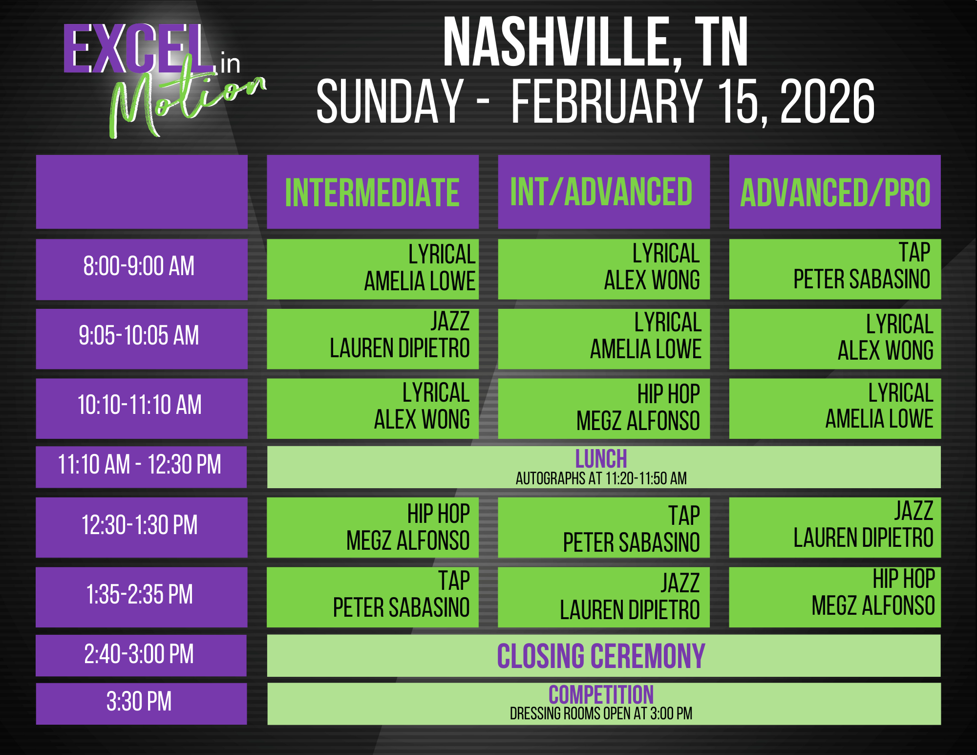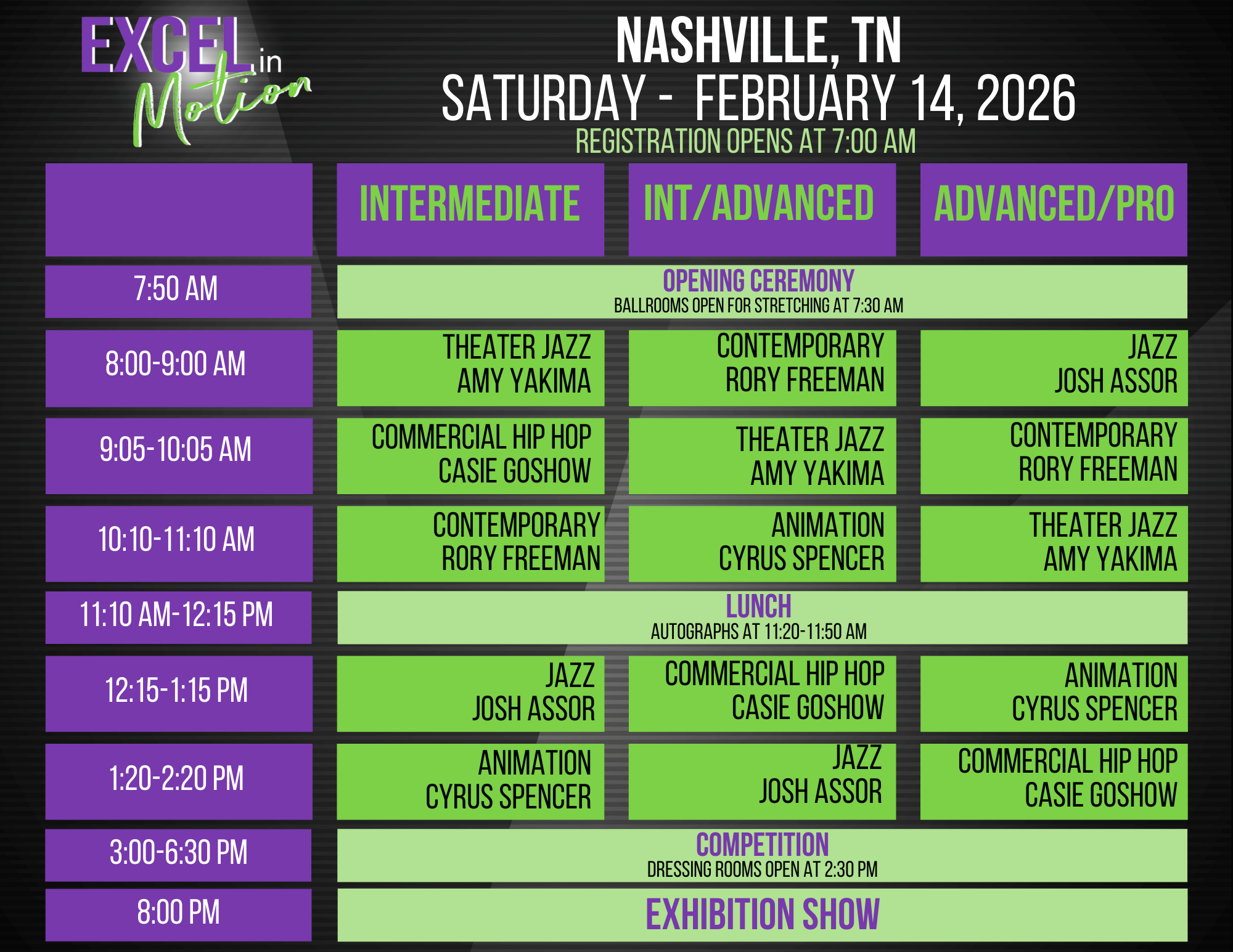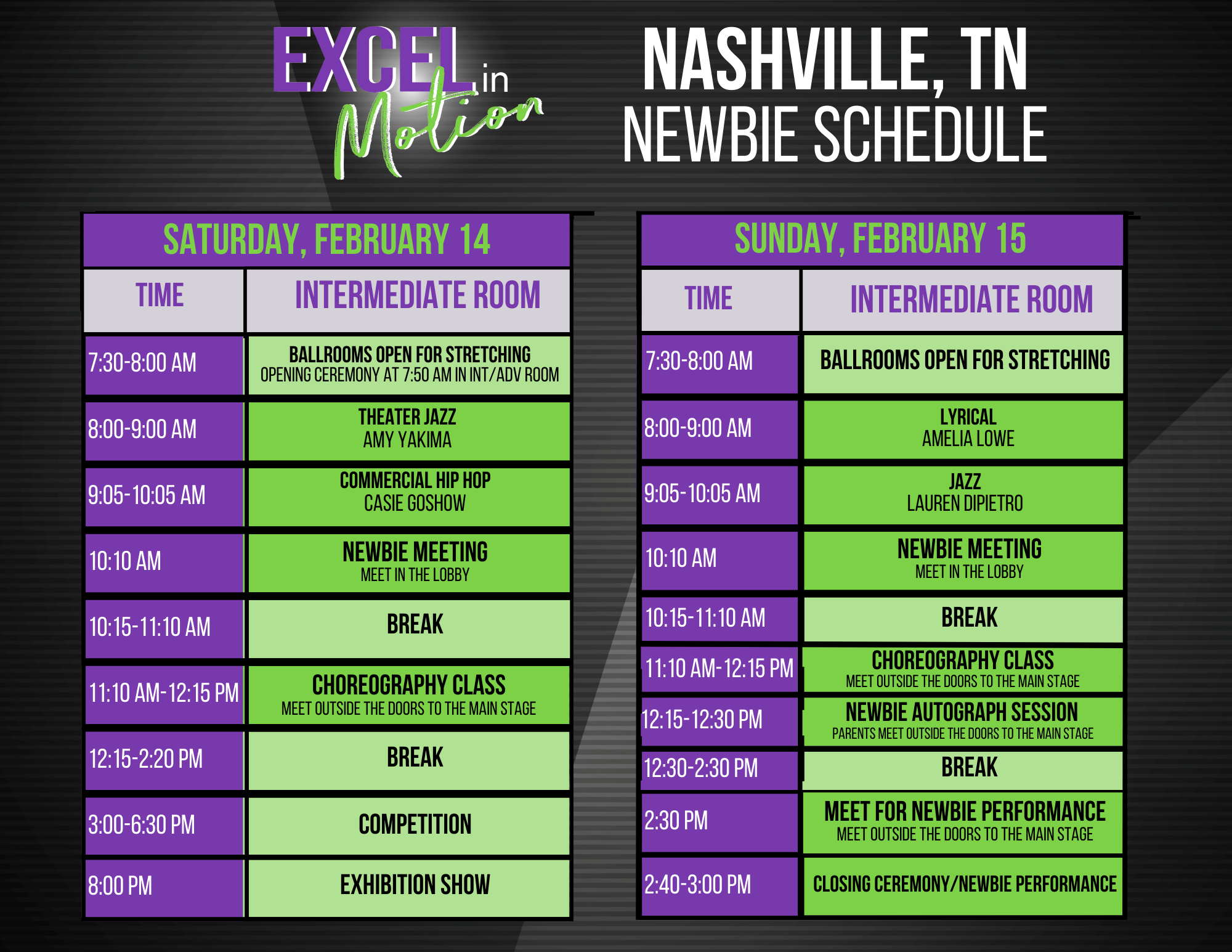 Below is the schedule for the Excel Convention in Nashville, TN and outlines the events for the weekend. Class order and times are subject to change.